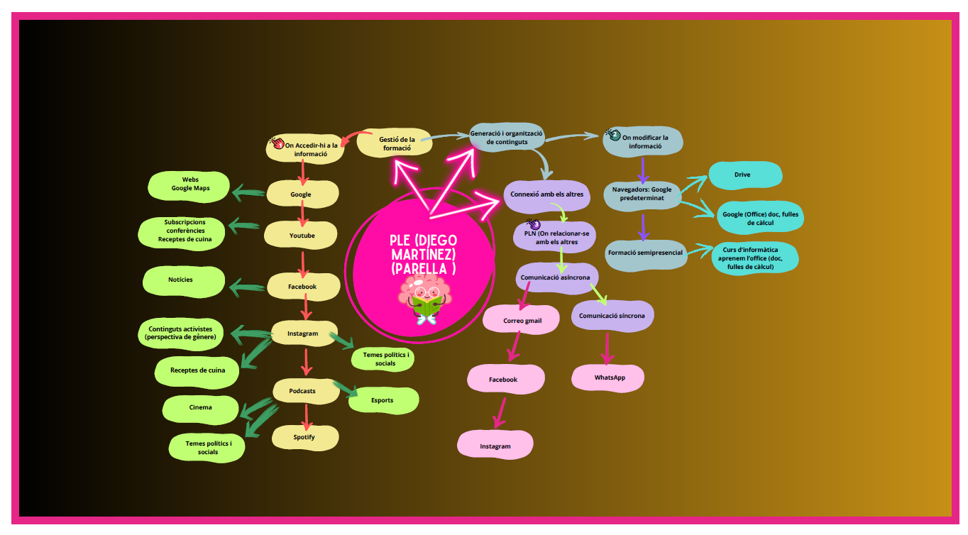En aquest PLE (Diego) es veu com des de la generació i organització de continguts és més habitual per dur a terme recerques d'informació les plataformes com ara, Google, YouTube, Facebook, Instagram. (perquè en Diego és molt actiu en les xarxes socials).